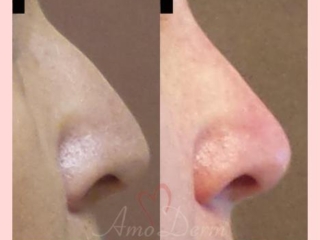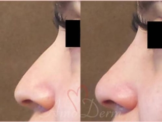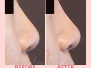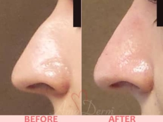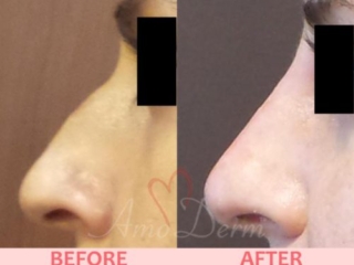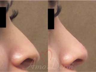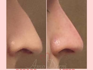 Non-surgical nose job is also known as injection rhinoplasty, liquid rhinoplasty or five-minute nose job. During this procedure, your Amoderm physician skillfully injects dermal fillers in various areas of the nose to correct many of the common problems such as tip deviation, nose deviation, humps, bumps and flat or side nasal bridge. For example, the appearance of a hump on the nose can be significantly reduced and made less prominent by injection of fillers above and below it. A dropped or deviated tip of the nose can be corrected or pulled upward by injecting fillers in upper areas of the nose and generating lift. For patients with flat or wide nose bridge, filler injection can be used to reconstruct the nose bridge and created a narrowed and better-defined nose bridge. An experienced physician can effectively reshape and sculpt a patient’s nose just like an artist with a few syringes of fillers.