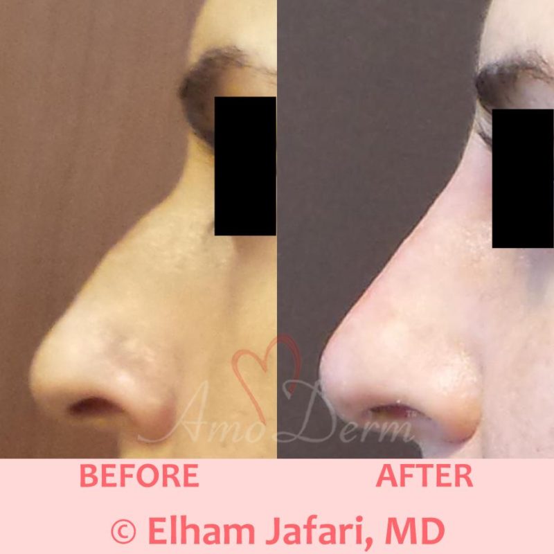 Non-surgical nose job is also known as injection rhinoplasty, liquid rhinoplasty or five-minute nose job. During this procedure, your Amoderm physician skillfully injects dermal fillers in various areas of the nose to correct many of the common problems such as tip deviation, nose deviation, humps, bumps and flat or side nasal bridge. For example, the appearance of a hump on the nose can be significantly reduced and made less prominent by injection of fillers above and below it. A dropped or deviated tip of the nose can be corrected or pulled upward by injecting fillers in upper areas of the nose and generating lift. For patients with flat or wide nose bridge, filler injection can be used to reconstruct the nose bridge and created a narrowed and better-defined nose bridge. An experienced physician can effectively reshape and sculpt a patient’s nose just like an artist with a few syringes of fillers.