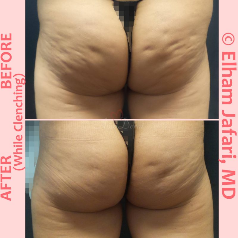 The active ingredient of Qwo is a specific type of collagenase enzyme that breaks down and releases the fibrous bands responsible for pulling the skin and creating dimples. This will help with redistributing the fat cells that had been trapped between the bands while stimulating synthesis and growth of new collagen. The skin contour will gradually get smoother and the appearance of dimples ad cellulite will improve over time.